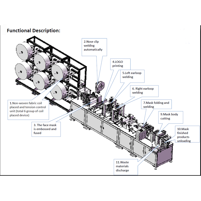 T/TThe new design of the whole machine, the full computer double frequency converter control,parameter setting, simple operation, auto error stop and display, fault display at a glance,positioning and automatic stopping function, simple transmission system, in line with the safety standards of class II medical devices.The thickness of the mask and the length of the nose bridge strip can be adjusted within a certain range. Both-sides ear-loop can be delivered and cut automatically, welded firmly, folded, formed,and waste will be removed. Adjustable producing speed according to different materials,production quality very stable,and high production efficiency.Advantage: Product positioning with high accuracy, low noise, smooth movement and stable performance.Remote operation control function is optional WITH EXTRA COST USD2980, including installation & training.