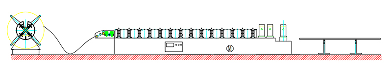 Decoiler→Feeding Guide Device→Roll Forming System→Hydraulic Post Punching & Cutting Device→Exit Rack